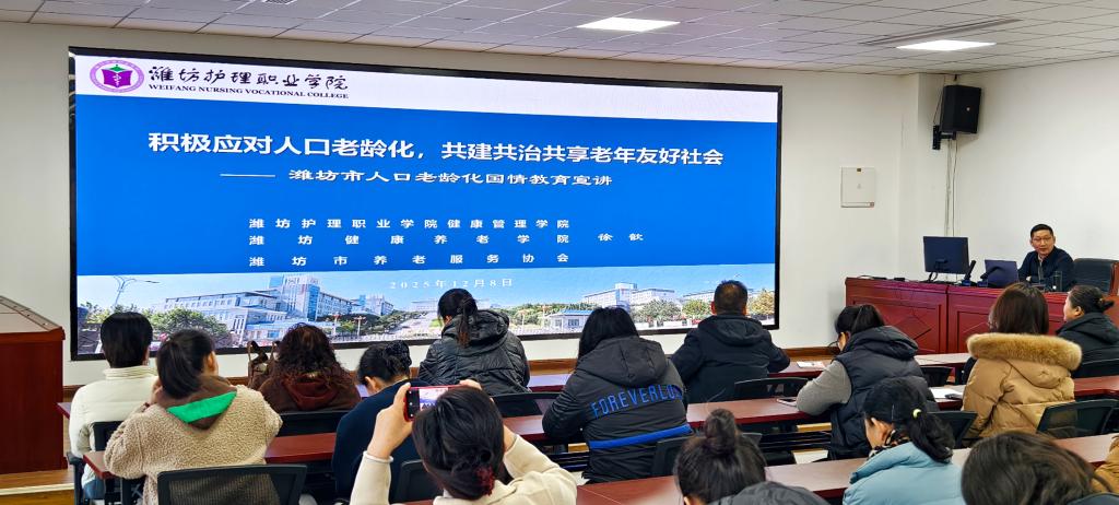 12月1日至10日,潍坊护理职业学院健康管理学院(潍坊健康养老学院)智慧健康养老服务与管理省级高水平专业群教师团队开展了潍坊市人口老龄化国情教育专题宣讲,通过深入不同县市区的社区、机构,直面基层群众与老龄工作者,致力于将积极老龄观、健康老龄化理念送入寻常百姓家。