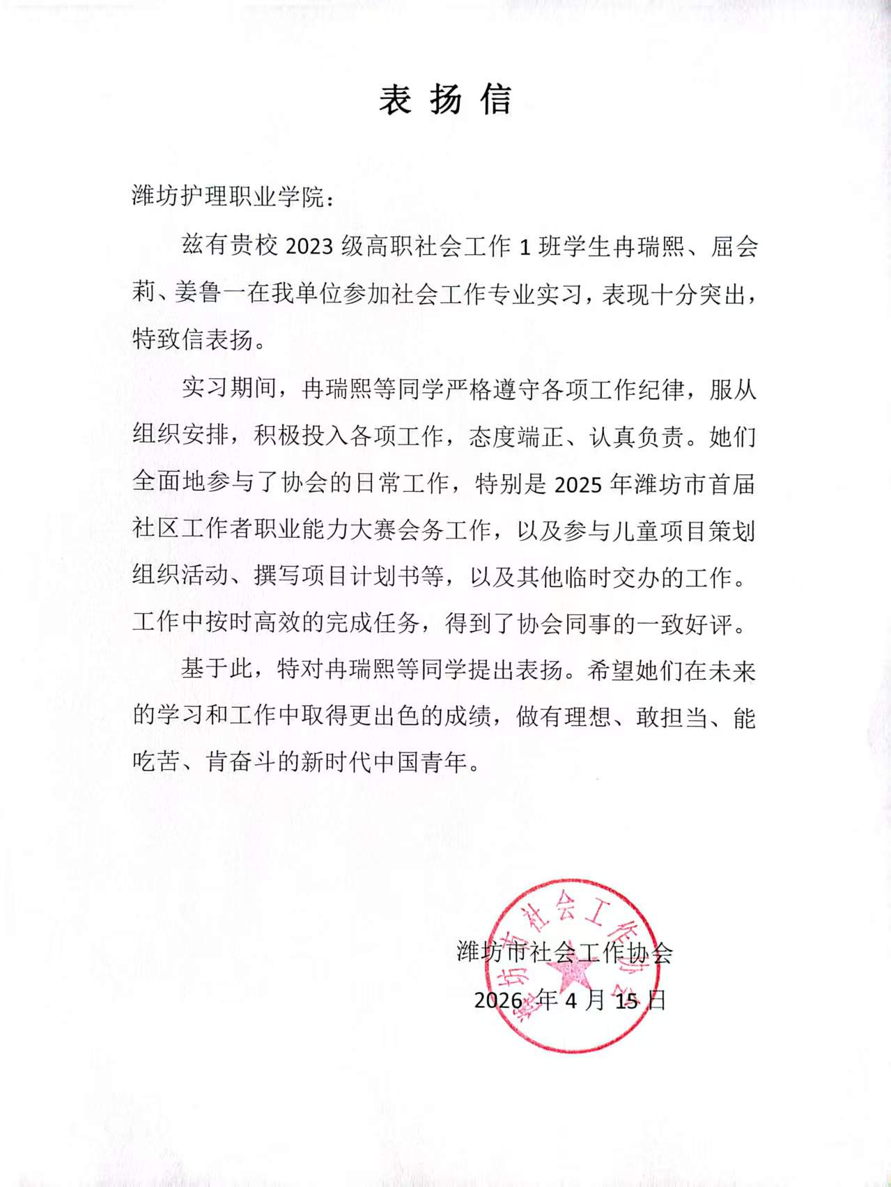 近日,潍坊护理职业学院收到来自潍坊市社会工作协会的表扬信,对学院2023级高职社会工作1班冉瑞熙、屈会莉、姜鲁一三名同学在实习期间的突出表现给予高度肯定。这一表扬不仅是对学生个人能力的认可,也体现了学院社会工作专业人才培养质量的持续提升。